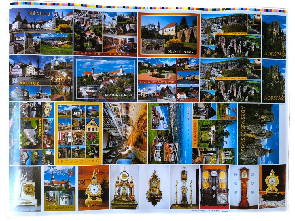 › Professional and educational › Nerozřezaný arch pohlednic Náchod, Nové Město nad Metují, Broumovsko - leporelo Zámecké hodinyorelo